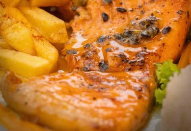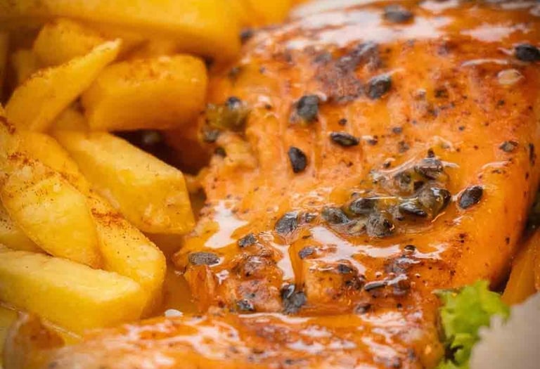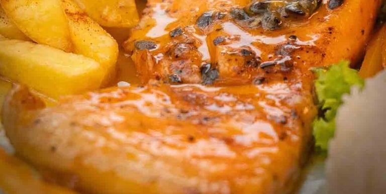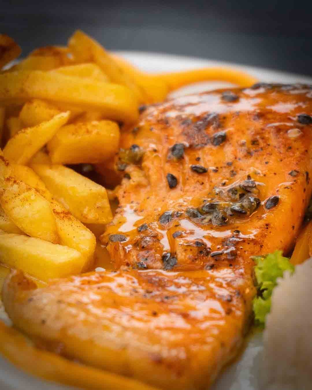 Salmón en salsa de maracuyá: Un contraste perfecto entre lo jugoso del pescado y la acidez tropical de la fruta.