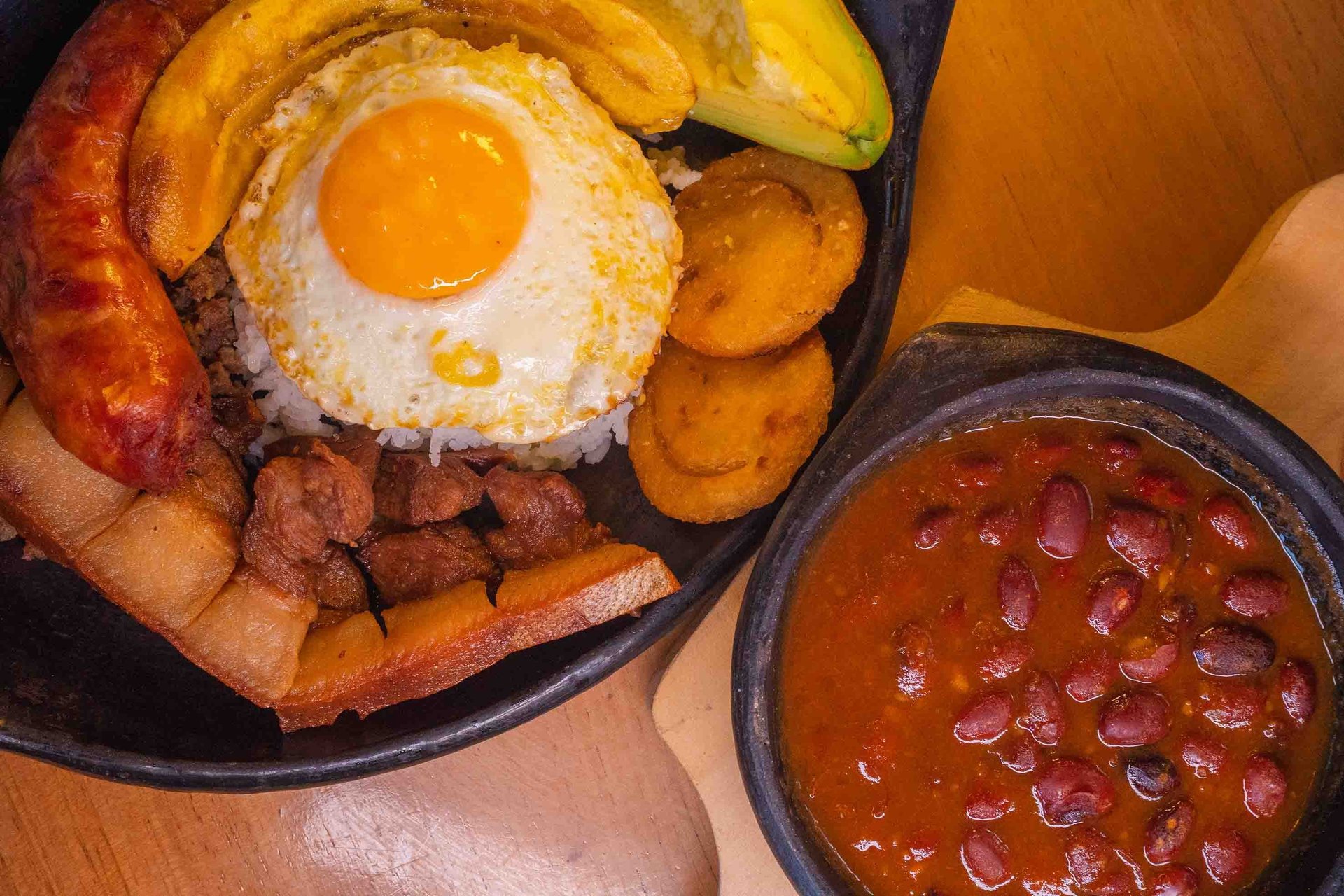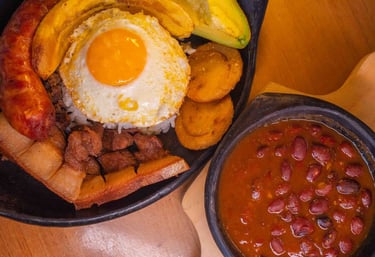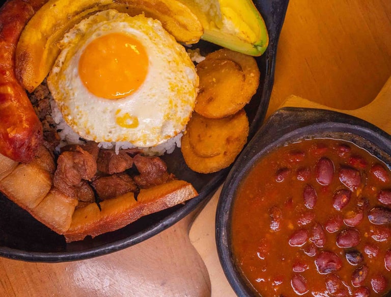Bandeja paisa: Frijoles, arroz, chicharrón, carne molida, huevo frito, aguacate, arepa y plátano maduro. Un festín de sabor y generosidad.