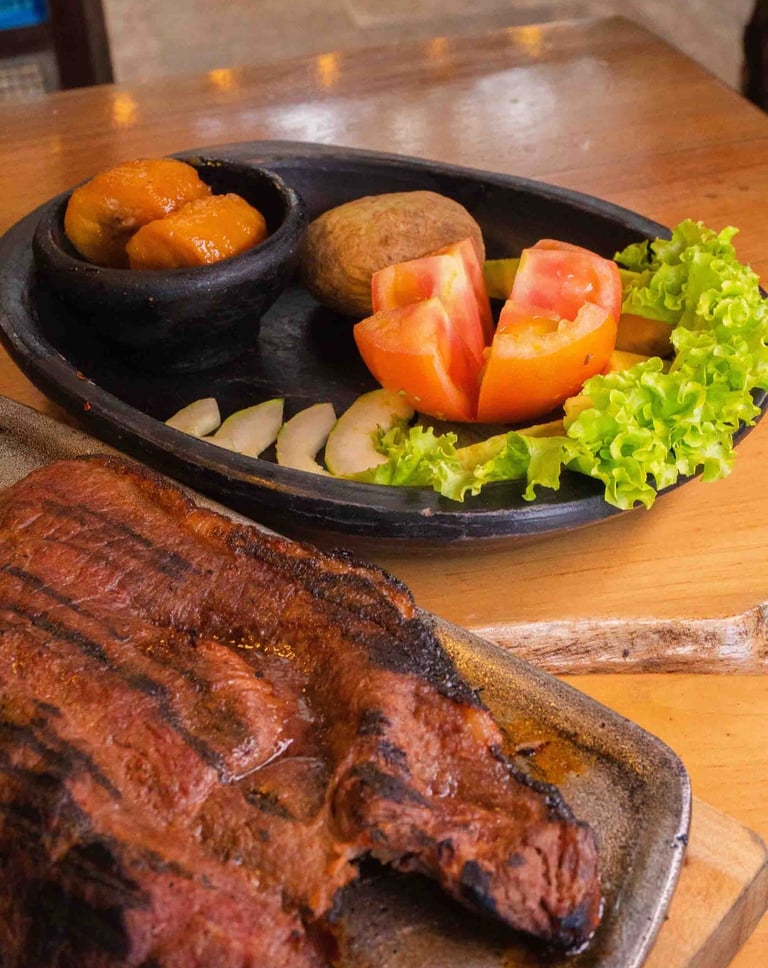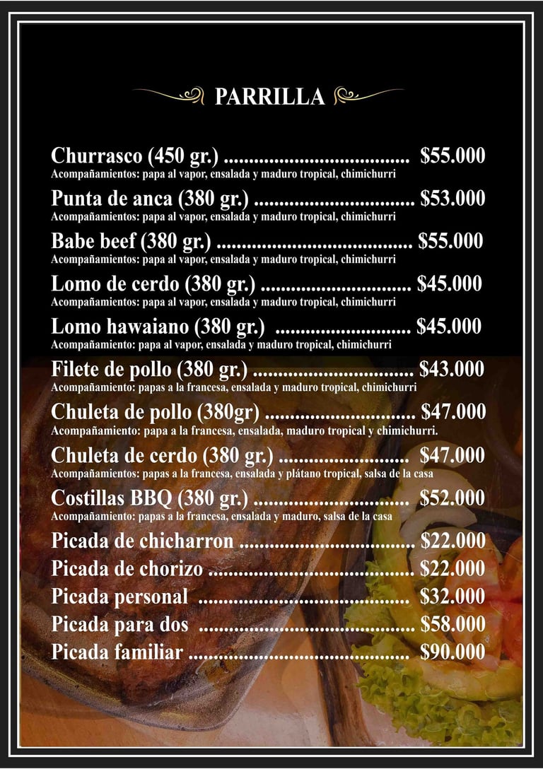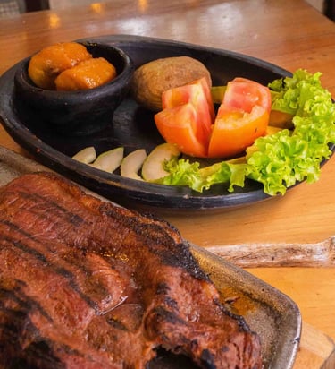 Punta de anca, churrasco, baby beef y costillas BBQ: Cortes seleccionados, cocinados al punto ideal y acompañados de guarniciones que realzan su sabor.