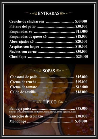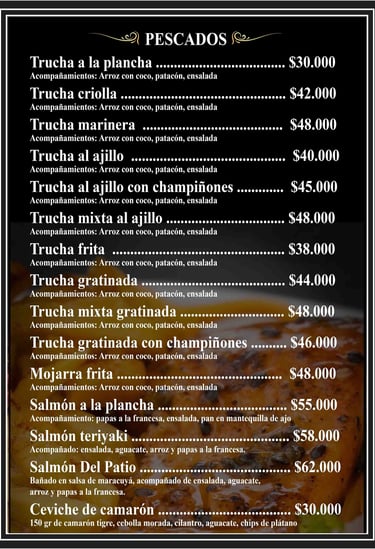 En El Patio, nos apasiona compartir lo mejor de nuestra tierra. Cada plato que servimos está inspirado en las raíces del Quindío, con ingredientes frescos, técnicas tradicionales y un toque creativo que sorprende. La trucha en salsa criolla, por ejemplo, es uno de nuestros tesoros: fresca, jugosa y bañada en una salsa que evoca los sabores de la montaña.