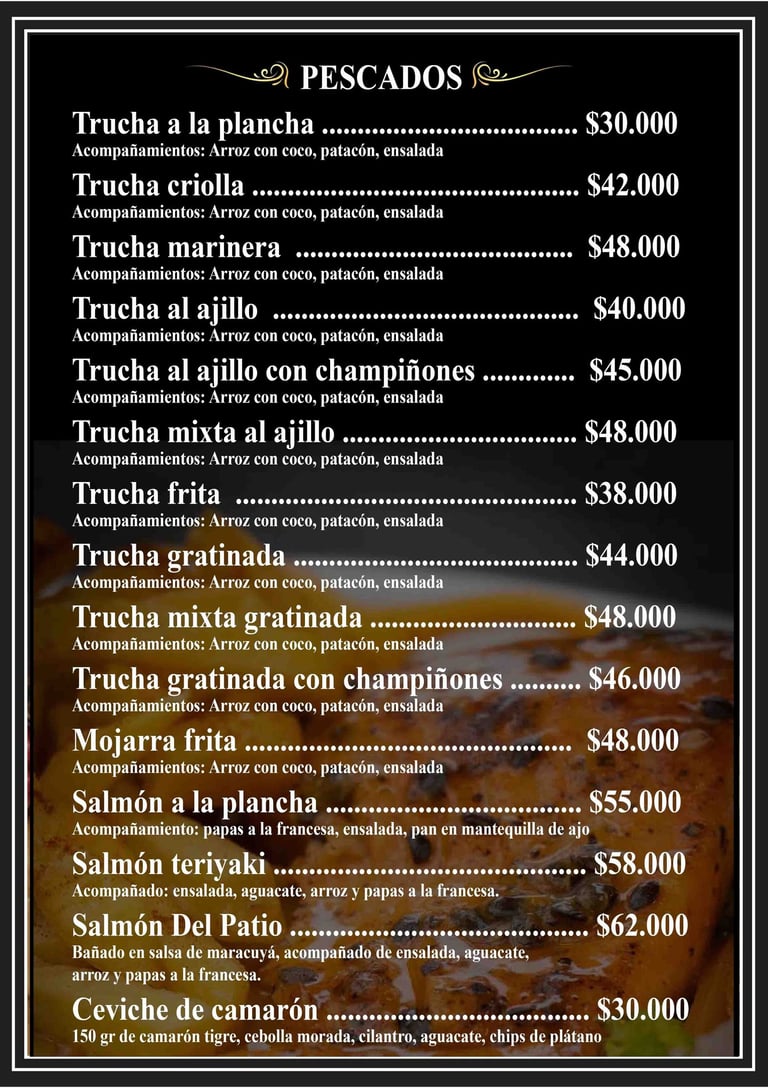 Prueba la trucha en salsa criolla y el salmón en maracuyá, junto a muchas otras recetas típicas e internacionales que te invitan a seguir descubriendo sabores únicos.